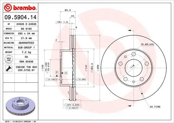 - BREMBO 09.5904.14 підходить до марок/моделей авто: