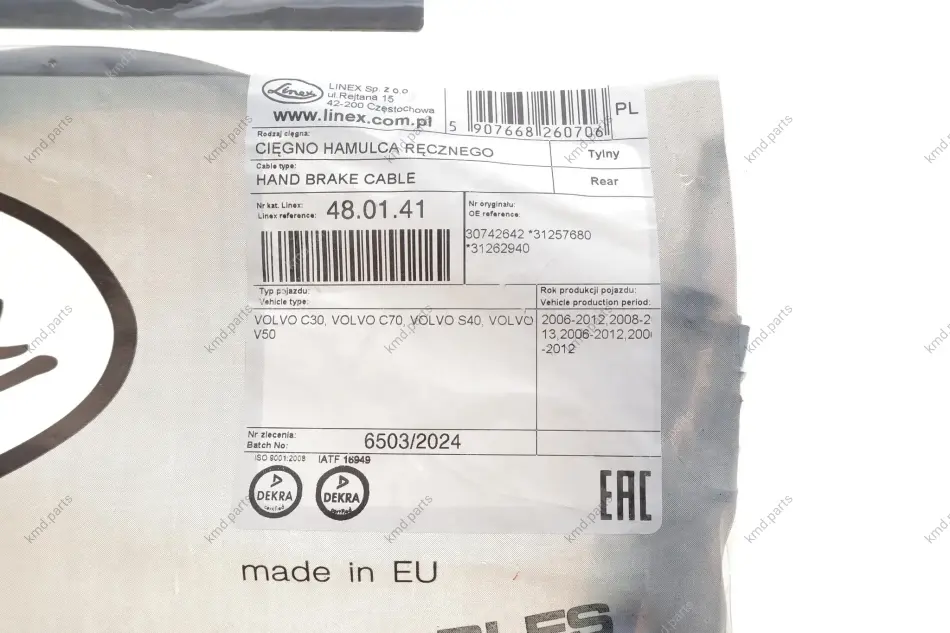 Трос ручника (задній) Volvo C30/C70/S40/V50 03-13 (1816/1860mm) LINEX 48.01.41